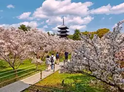 Kyoto's must-visit cherry blossom spot, Ninna-ji Temple, located in Ukyo Ward and recognized as a UNESCO World Heritage Site, is a place of historical and cultural significance. In addition to its iconic attractions such as the National Treasure Golden Hall, the Peacock King painting on silk, the Nio Gate, and the Five-Story Pagoda, the highlight during spring is undoubtedly the "Omuro Sakura" cherry blossoms.