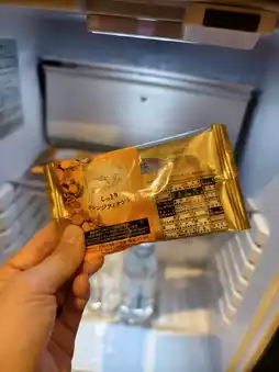 There are 2 bottles of water and 2 small orange cakes in the refrigerator for guests to enjoy. Coffee and tea bags are also available.