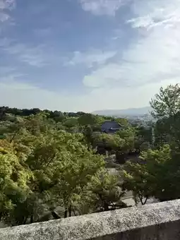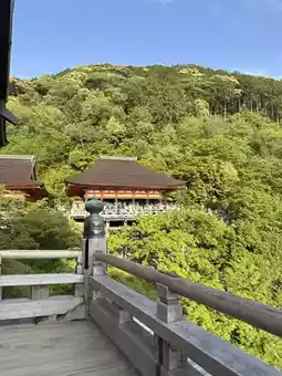 A wooden balcony extending from the temple, you can see the full view of Kyoto.