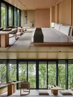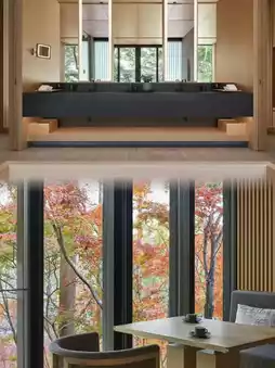 Aman Kyoto was originally the private garden of a celebrity, spanning 32 hectares where the original owner meticulously cultivated ancient trees and mosses over 300 years old. The most breathtaking feature is the central water courtyard—a mirror-like pond reflecting the ever-changing mountain scenery through the seasons: cherry blossom petals floating in spring, maple leaves staining red in autumn, and snow covering the karesansui (dry landscape) in winter, making it the spiritual symbol of Aman Kyoto.