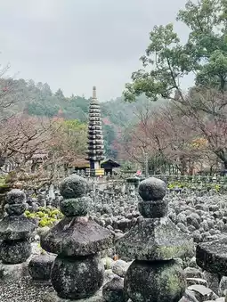 A solemn space with thousands of stone Buddha statues. In autumn, the contrast between the statues and the vibrant foliage is breathtaking. The bamboo path at the back of the temple grounds is also enchanting ✨