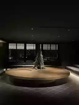 The interior features a chic atmosphere with black as the main theme, complemented by indirect lighting that creates a serene beauty. The entrance is adorned with a single pine tree and welcoming stones, evoking the essence of a Japanese garden.