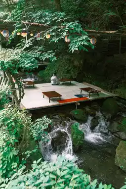 At Rurikoin, the lacquered table on the second floor mirrors the view outside. Sanzen-in boasts ancient trees, moss-covered grounds, a babbling stream by a red bridge, and adorable Jizo statues. I personally love Hosen-in for its tranquility—sip matcha and enjoy sweets in a 270° garden view. Kibune Shrine glows magically at dusk; don’t miss the water fortune-telling or the riverside afternoon tea—pure bliss for cooling off in early summer!