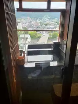 The open-air bath on the top floor offers views of Kyoto's nature and cityscape.