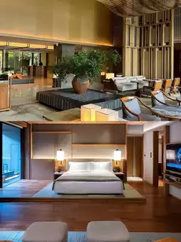 The rooms continue the minimalist Japanese aesthetic, with wood tones paired with stone materials, soft lighting, and tatami elements. Even the kettle, slippers, and tea sets are custom-designed, perfectly blending everyday functionality with luxury.