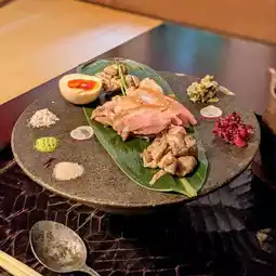 The duck and porridge are served separately, featuring three different cuts—duck breast, duck leg, and duck neck—each prepared in its own unique way. Sprinkled with three types of seasoned salts, the flavors are rich and fresh, offering a distinct taste compared to the cold duck dishes typically found in izakayas.