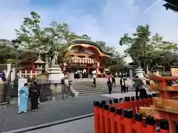 The main hall (Honden) of the shrine is equally majestic, showcasing traditional Japanese architectural artistry 🎎. It stands out with its sacred red-and-gold tones and fox statues 🦊, which are considered messengers of the deity Inari.
