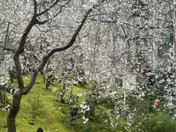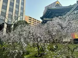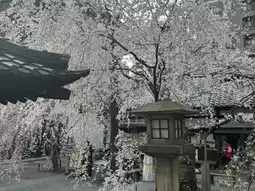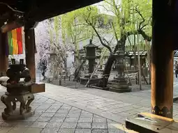 Within the temple grounds, the weeping cherry trees are in full bloom, creating a stunning sight. Next to the cherry trees stands a massive willow tree, with its vibrant green branches contrasting beautifully against the red blossoms. This willow tree, known as the "Enmusubi Rokkaku Willow," is one of the temple's highlights.