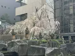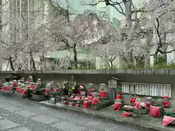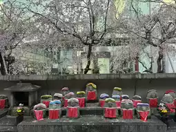 Near the commercial building side of the temple, there is a collection of Jizo stone statues, so numerous that the area is called "Jizo Mountain." Behind Jizo Mountain, several cherry trees are in full bloom, casting a delicate pink hue over the statues, creating a captivating scene.