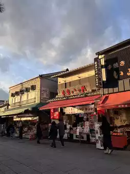 Gion is really beautiful. Old wooden houses are lined up, and the soft orange lights make you feel like you're walking in a movie scene.