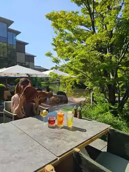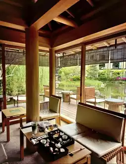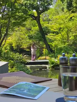 Fuju (teahouse lounge): Matcha and local sake served in a glass-walled space overlooking Sekisuien Garden