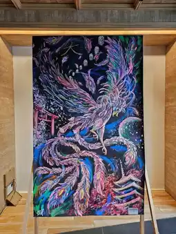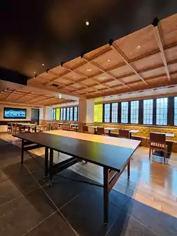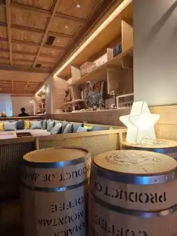 A photogenic social lounge with a bi-color design of wood and black. Free coffee (Kyoto's "Ogawa Coffee") is available in the morning, while the lounge operates as a café during the day and a bar at night.