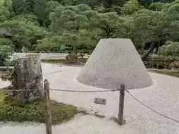 Ginkaku-ji is renowned not only for its architecture but also for its exquisite gardens. The temple's garden is a stroll garden centered around the "Kinkyochi" pond, inspired by the Saihō-ji (Moss Temple) and attributed to the famous garden designer Musō Soseki. Although the garden was modified during the Edo period, reducing the pond's size, it still retains a profound Zen aesthetic and harmony with nature. The most striking features are the "Ginshadan" (Silver Sand Sea) and the "Kōgetsudai" (Moon Viewing Platform). The former represents waves with its raked sand patterns, while the latter is a 165 cm tall cone-shaped mound resembling a miniature Mount Fuji, symbolizing moon gazing and meditation. These karesansui (dry landscape) elements are often credited to the gardener Zen'ami, showcasing Higashiyama culture's pursuit of abstract beauty.