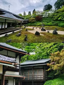 As you slowly walk along the narrow stone paths, you can feel the breath of nature with every step. The moss garden, harmoniously paired with the temple's neat wooden structures, feels like a poetic anthology that quiets the noise of the mind.