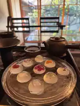 Rokujuan offers a cup of tea in a 100-year-old traditional Kyoto house. Enjoy beautiful warabimochi (rice cakes) decorated with flowers, and note that each person can order one item!