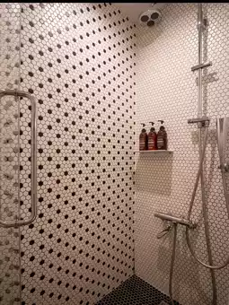 The shower room also has beautiful tiles and a cute faucet. ♬