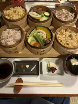 The seasonal vegetable steamed rice was delicious and filling. The interior is Japanese-style and very comfortable.