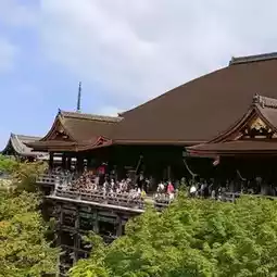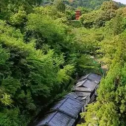 The temple's signature feature is its wooden terrace jutting out from the base of the mountain. It was built without a single nail. From here, you can enjoy panoramic views of Kyoto and the lush green mountains. If you're in season for autumn leaves and cherry blossoms, you'll be amazed!