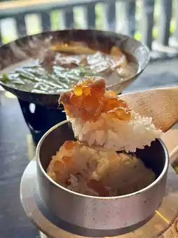 The freshly cooked kamameshi rice bowl was luxuriously topped with plump salmon and a generous amount of salmon roe, and just the appearance was enough to get me excited! 🥰