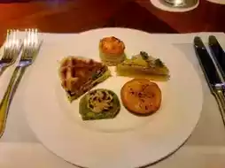The savory items consist of five varieties, beautifully plated and brought to the table. These include a croque monsieur with truffle, a quiche harmonizing shrimp, sweet potato, and pumpkin, a waffle sandwich, a pie topped with salmon roe, and a pistachio cake with chestnut cream. All pair wonderfully with champagne. The piano melodies further enhance the experience, and the attentive staff frequently tidies the table, making me feel truly pampered.