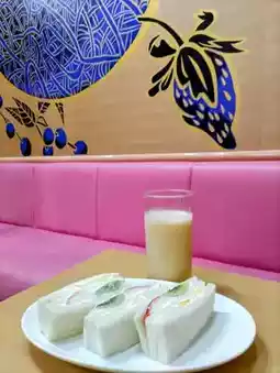 After arriving at Kyoto Station, we headed to the fruit parlor Yaoiso. This long-established fruit specialty store, founded in 1869, is conveniently located near Hankyu Omiya Station and Randen Shijo-Omiya Station. The interior features murals by Kimura Hideki, which we admired while enjoying fruit sandwiches.