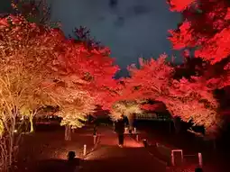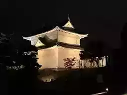 In the evening, at the urging of our travel companions, we visited Nijo Castle in downtown Kyoto. While it's usually open until the afternoon, we happened to have a limited-time exhibition on the day of our visit, giving us the opportunity to visit in the evening. I had hoped to visit the limited-time Honmaru Palace, but I was surprised to find that I had to pay an additional entrance fee in addition to the exhibition ticket, so I decided against it. The Ninomaru area within the city center featured various light projections, simple vendors, and the blooming maple leaves at night. I was already a bit tired of seeing the maple leaves all day, but I didn't expect the leaves illuminated at night to take on a whole new dimension. It was truly blissful.