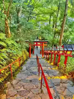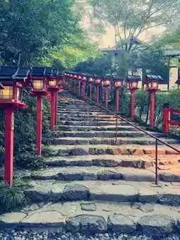 The lights of Kibune Shrine lit up at dusk, blending perfectly with the atmosphere. The only word to describe it is "divine." However, before reaching the inner shrine, I was already feeling dizzy. I rested and took photos near the steps and the main gate.