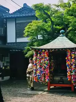 Located in the Higashiyama district, close to Kiyomizu-dera Temple, it's a convenient place to stroll around. The temple's world-famous highlight is the "Kukuri-zaru" (monkey balls) 🐒, colorful cloth balls hung everywhere. Each ball represents a monkey with its hands and feet bound. This symbol teaches us to control our desires and unnecessary desires. 💖 If we give up one unwholesome desire, our wish will be granted.