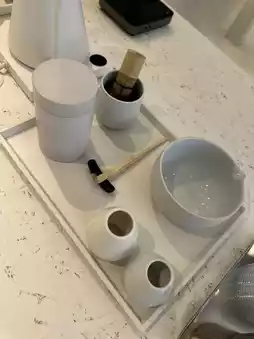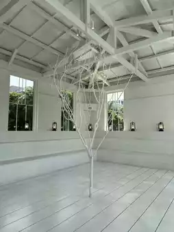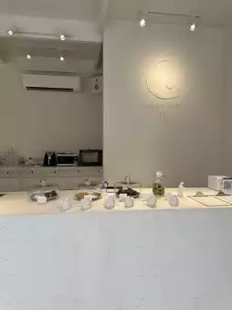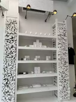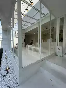 ตกแต่งในโทนสีขาวทั้งหมดเช่นดียวกัน และกรุด้วยหน้าต่างกระจกใสทำให้ภายในร้านสว่างจากแสงธรรมชาติ