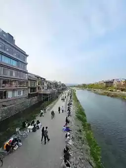 A stroll along the Kamo River in Kyoto in the evening is a delightful and peaceful experience. 😌 As the sun begins to set, a soft orange glow illuminates the water's surface, creating a breathtaking view. 🌇 Locals and tourists alike come out to relax, whether it's strolling slowly, walking their dogs 🐕, or picnicking on the lush green banks. 🧺 The atmosphere is tranquil yet lively. The gentle sound of the water flows, mixed with soft laughter and conversations on the breeze. 🍃 It's the perfect opportunity to escape the hustle and bustle of the city, breathe in the fresh air, and enjoy Kyoto's natural beauty before night falls. ✨