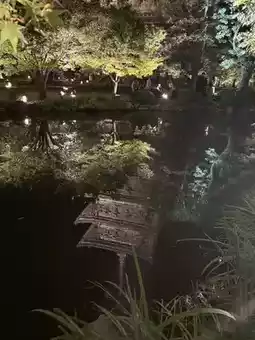 The illuminated pagoda is reflected in the pond, and in the silence of neither wind nor sound, only a faint light sways.