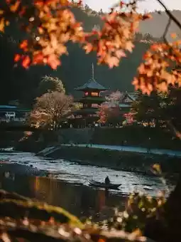 Stand in the middle of the bridge at dawn, watching the Hozu River reflect the continuous red cliffs in the mist. Rent a vermilion boat to drift downstream, the boatman humming "Ogura Hyakunin Isshu" as he poles, startling egrets whose wing tips skim the water like scattered gold.