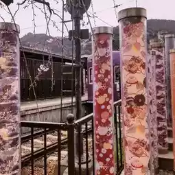 I arrived at Keifuku Arashiyama Station just as dusk began to settle. Stepping out of the station, the world transformed. Rows of tall, cylindrical pillars lined the path, each one glowing from within. This is the Kimono Forest—a collection of vibrant textile cylinders filled with acrylic fiber that shimmer like precious jewels against the darkening sky.