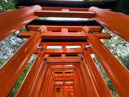 The Thousand Torii Gates at Kyoto's Fushimi Inari Shrine are a must-see for photos. Each vermilion torii gate exudes an ancient charm, set against a backdrop of autumn foliage, stylish yet historically significant. Climbing the stairs offers panoramic views of Kyoto, a truly magnificent sight.
