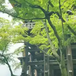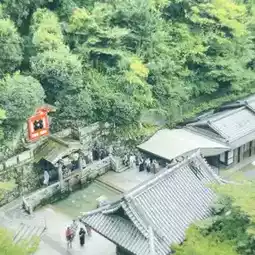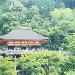 Kiyomizu-dera Temple, also known as Kiyomizu-dera, is perched high above the grounds, offering breathtaking views of the Kyoto cityscape beyond the lush forest. ✨🌿