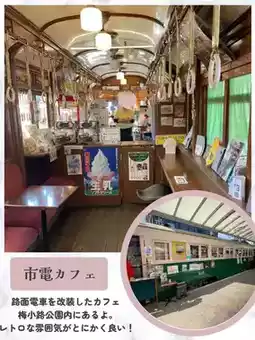 A train cafe. It's near the Kyoto Aquarium. It's interesting that the train straps are made into bread! You can enjoy the atmosphere of an old train.