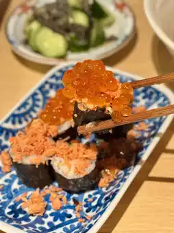 ・Salmon and Salmon Roe Oyako Sushi: A generous amount of salmon and salmon roe on a cucumber roll!