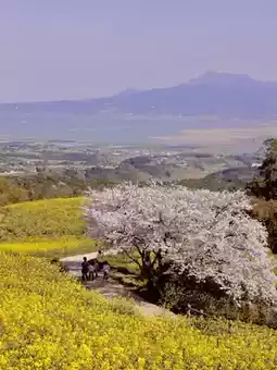 🌼 Nagasaki – Shirakimine Plateau: Witness the stunning contrast of pink cherry blossoms and yellow rape flowers.