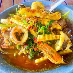 🍽️Recommended menu: Stir-fried spicy seafood with hot chili and ginger flavors. The ingredients are fresh as if they were caught from the sea in front of the restaurant.