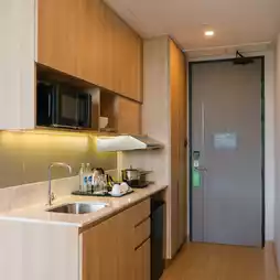 ห้องที่เราพักวันนี้คือห้อง One Bedroom Suite ห้องนี้จะมีห้องรับแขกแยกต่างหาก ภายในห้องมีอุปกรณ์ครบครัน ทั้งครัวเล็กพร้อมไมโครเวฟ และเครื่องซักผ้า ห้องน้ำมีอ่างอาบน้ำ ส่วนวิวจากห้องนอนนั้น ขอบอกว่าวิวดีสุดๆ