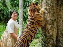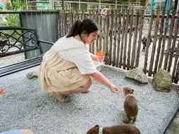#PattayaTravel Today, we're taking you to Tigertopia, a tiger zoo in Sriracha, Pattaya. Our main goal is to play with two newborn capybara babies, all wearing adorable gold and silver necklaces. Min loves that it's a small zoo, not too big, perfect for a relaxing visit. There are tiger shows, crocodiles, and lions, photo opportunities, walking tours, feeding, and a variety of activities. There are also cute animals like goats, rabbits, and the capybara we just met.