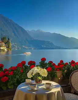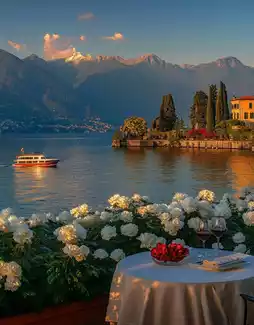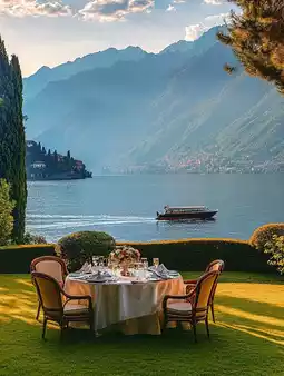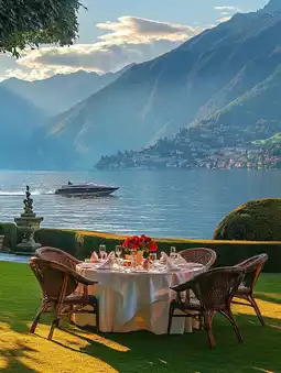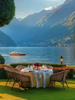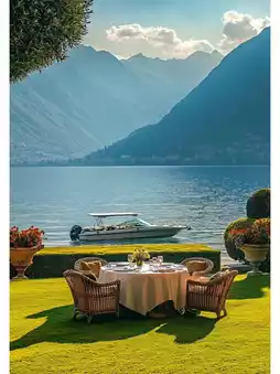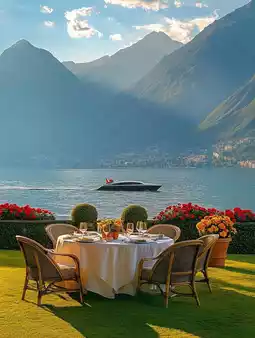 There is a table by Lake Como in Italy, the most beautiful table||There is a table by Lake Como in Italy, the most beautiful table, and of course, there must be a boat.