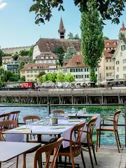 Lucerne, located in central Switzerland, is a city nestled between a lake and the Alps. In the early morning, Lake Lucerne is as calm as a mirror, reflecting the distant snow-capped mountains. A wisp of mist drifts above, casting a dreamy glow over the city.