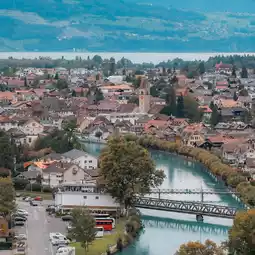 Nestled at the foot of the Alps, Interlaken is flanked by two alpine lakes. These interconnected lakes are Lake Brienz (Brinzersee), situated at a higher elevation, and Lake Thun (Thunersee).