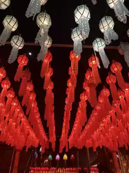 Hundreds of thousands of colorful Lanna lanterns hang throughout Wat Phra That Hariphunchai Woramahawihan, especially beautiful at night when the lanterns are illuminated.