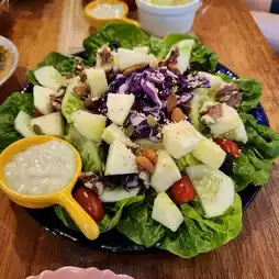 Service was fast, good ambiance. They also sell paintings that decorate their walls. Their portions are really big. Friendly staff. Get their lemongrass ginger tea!