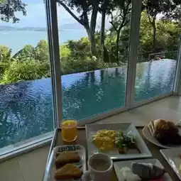 Ambong Pool Villas is pure “private island” energy without actually leaving Langkawi. Each villa has its own infinity pool and jaw-dropping panoramic views of the Andaman Sea—seriously, you’ll never want to leave your room. The décor is modern tropical chic, with soft linens, wooden accents, and huge windows that make the sea feel like part of your living space. My favorite part was having breakfast served in the pool—it’s so photogenic and indulgent at the same time. Evenings are for soaking in the pool while the sun dips below the horizon, turning everything gold and rose. Because it’s set up on a hillside, you feel tucked away in your own little world. Perfect for couples or solo travelers who want privacy, peace, and the ultimate “queen of my own paradise” vibe.