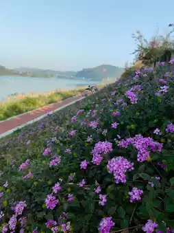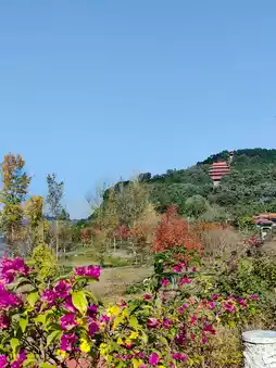 Ginkgo leaves are yellow, maple leaves are red, bougainvillea and chrysanthemums on the embankment are in full bloom, and the scenery is beautiful.