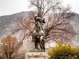 After leaving the Qianbulgak Pavilion of Wuchuanshan, slowly walk down the long corridor to the east to reach Zhaotai and Baguatai. This is located above Donglonggu, and Mengcheon flows below. Looking up, you can see the waterfall pouring down from Donglonggu, and looking down, you can admire “Mengcheon,” the best of Wuchuan. “Meng” is one of the 64 hexagrams, with Gan above Gam, Gam means water, and Gan means mountain. The character “Meng” implies that there is danger under the mountain. Li Wen, a person from the Ming Dynasty, left a poem praising Mengcheon: “The merchant invited me to brew freshly picked tea leaves, and the water was drawn from the fifth spring in the mountain.” In front of the gate is a statue of Guo Jubing. In the square, there are street vendors playing ring toss. It is truly a large city square. Twenty years have passed, but there has been no significant change. What's unfortunate is that many of the old trees on the mountain have withered.