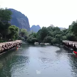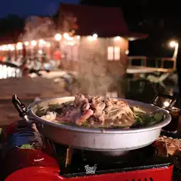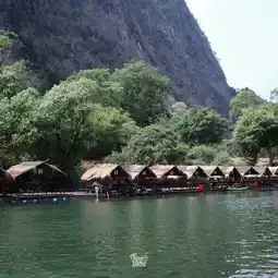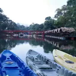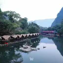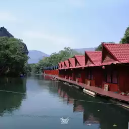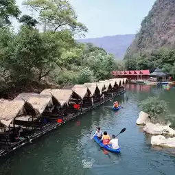 It is a place surrounded by mountains. There is a raft by the river where you can sit and eat in a chill atmosphere. There are also boating activities to do.